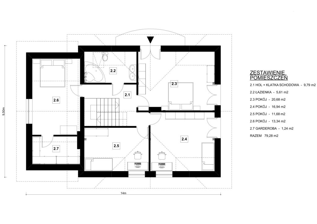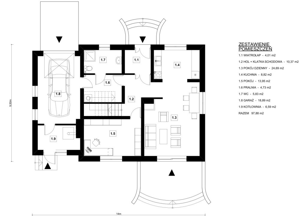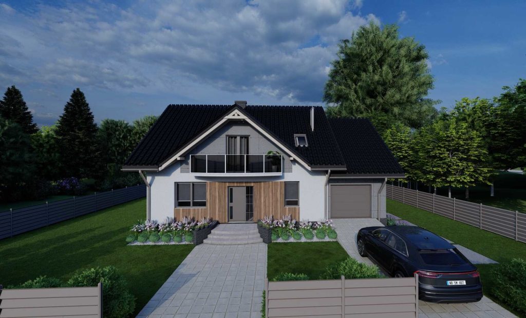 Powierzchnia użytkowa – 158,27 m2 Powierzchnia zabudowy – 129,54 m2 Kubatura – 751 m3 Garaż – 18,89 m2 Wysokość budynku – 8,15 m Liczba kondygnacji – 2 Kat nachylenia dachu – 38 ° Minimalne wymiary działki – 27,50 m x 22,00 m
